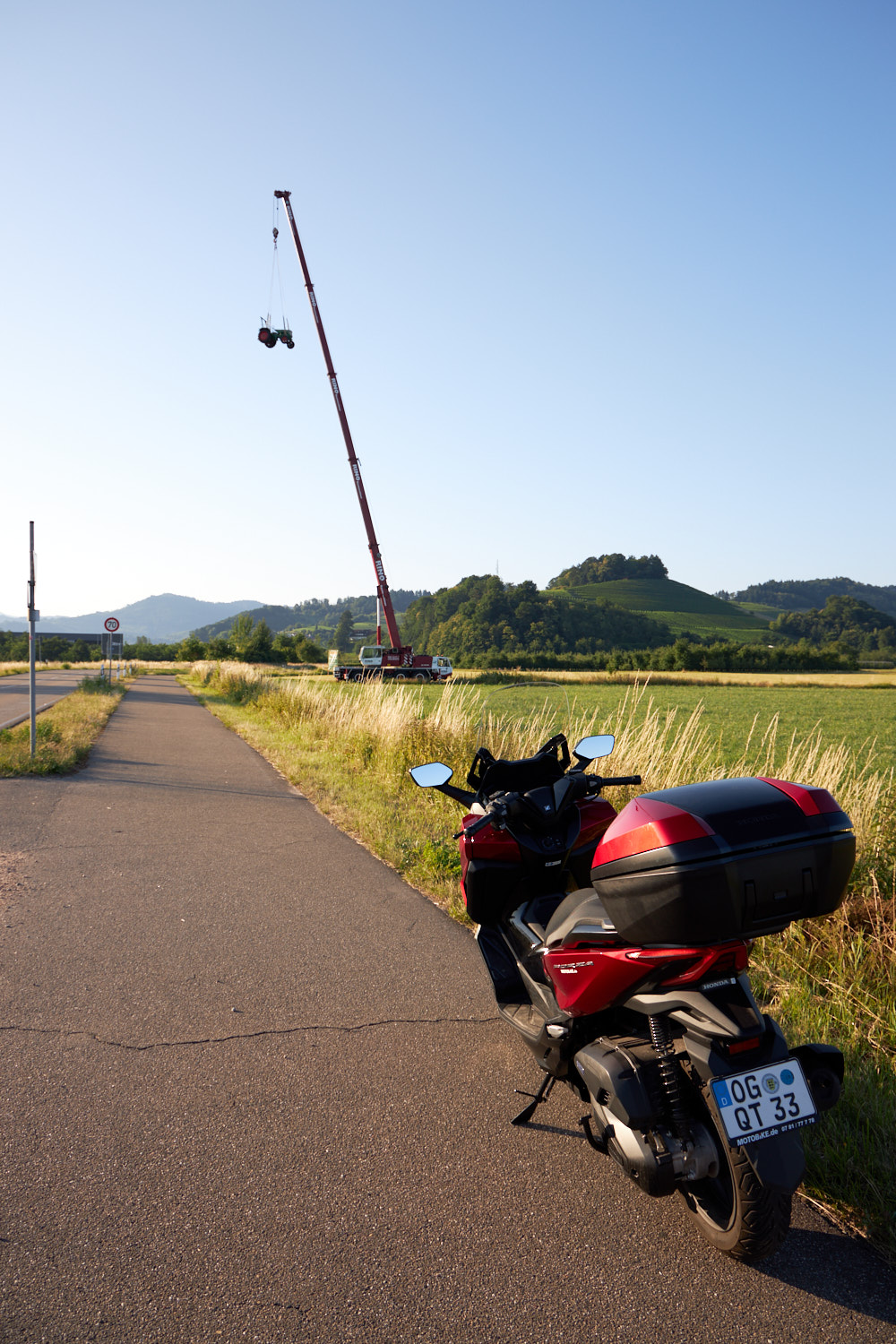 Heute sieht es auch wieder gut aus. Um halb sieben sitze ich auf dem Roller und fahre los. Erst mal Renchtal, dann weiter schauen. Kurz vor Oberkirch hängt ein alter Traktor an einem Autokran. Was soll denn das bedeuten? Eine etwas aufwändigere Diebstahlsicherung?