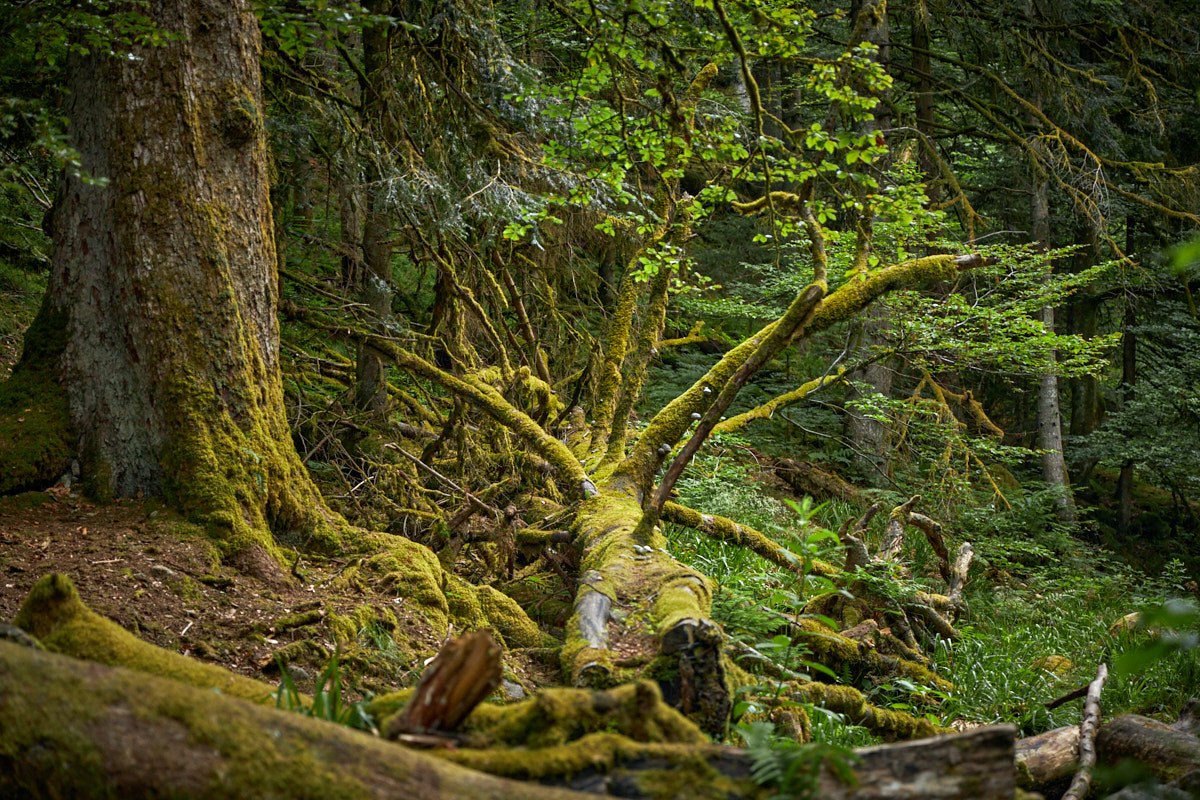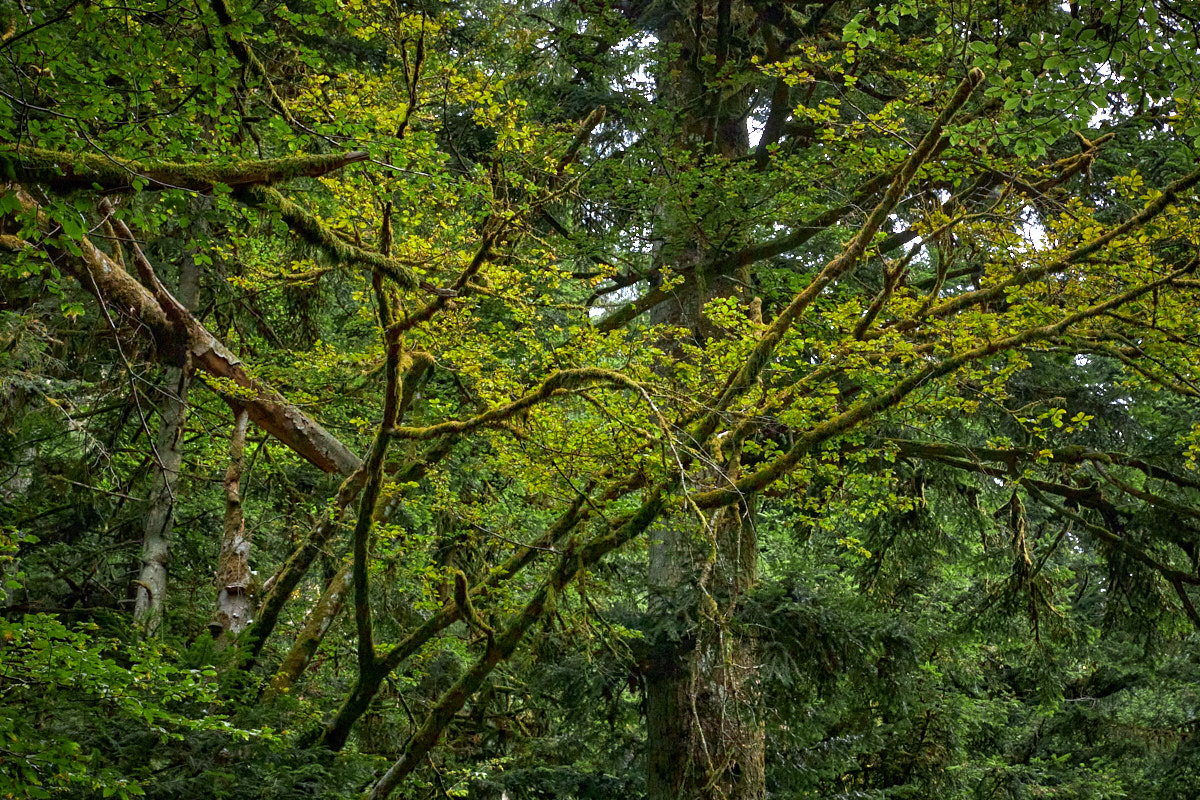 Ich möchte wenigstens kurz am Talausgang der Wasserfälle anhalten. Wasser trinken, austreten, danach fährt es sich wieder entspannter. Aber dann sehe ich, dass der Pfad direkt hier los geht. Schon 30 Meter weiter stehe ich mitten zwischen bemossten Steinen, flechtenbewachsenen Ästen und umgestürzten Bäumen. Es ist wunderschön hier, und immer noch kein Mensch da außer mir.