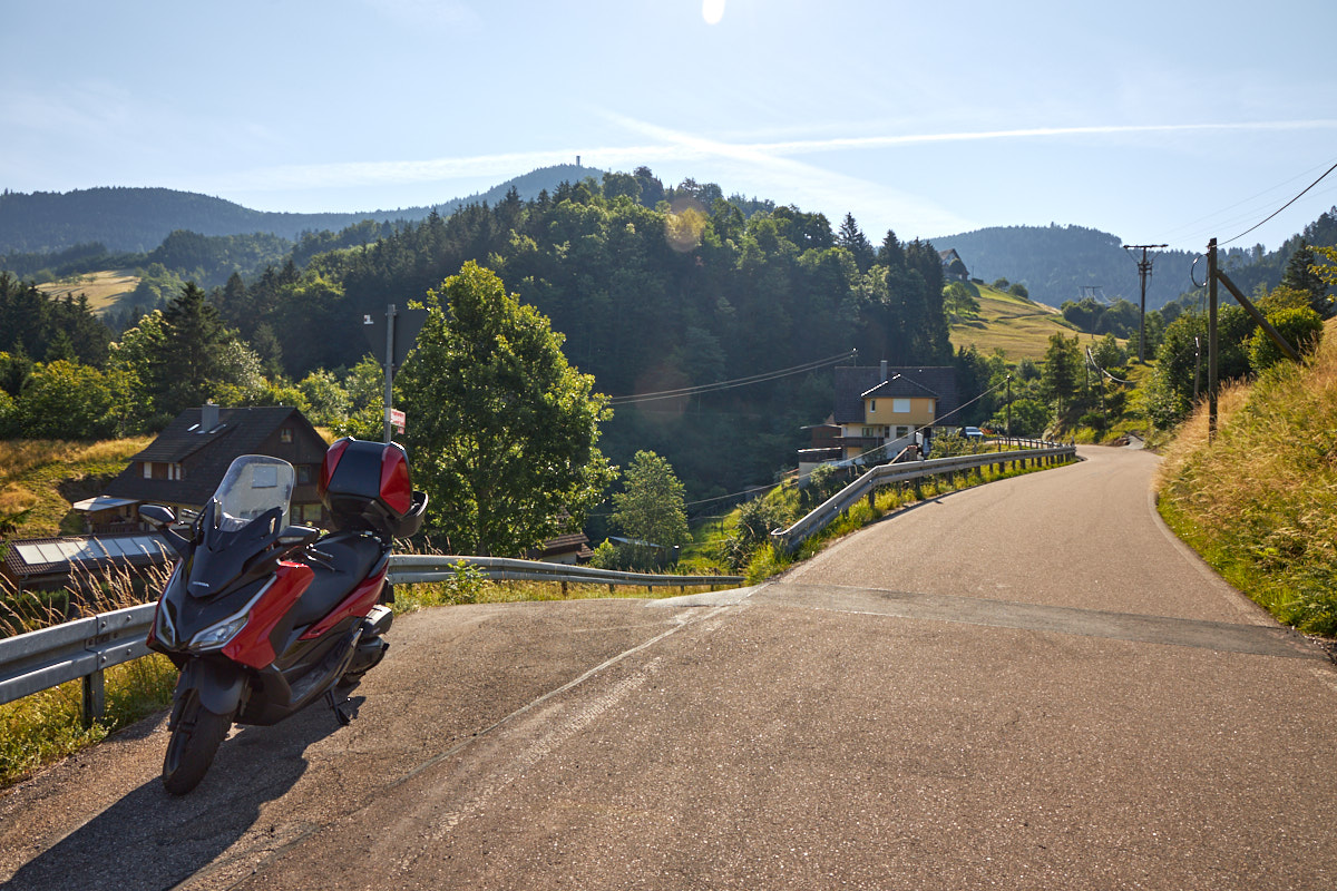 Ich setze mich also direkt vor der Oppenauer Kirche auf das Bänkchen unter der Linde und esse mein Käsebrot. Ein anderer Biker parkt direkt daneben, spricht mich an. „Was ist denn das für ein Roller?“ Fachsimpeln, Erfahrungen austauschen, auch mal schön. Es kommen mehr Menschen, gleich beginnt die Messe. Ich höre Orgelmusik von drinnen. Klingt ein bisschen wie der Pachelbel-Kanon.