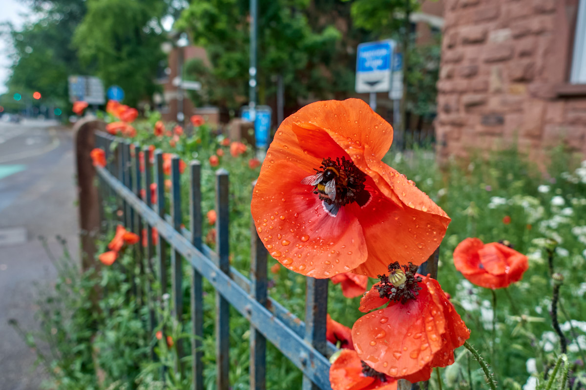 In den letzten zwei Wochen hatte ich einige Regenpausen abgepasst, um Besorgungen zu erledigen oder wenigstens kurz vor die Tür zu kommen. Zum Beispiel nur schnell mit dem Rollstuhl zum Bauernladen. Unterwegs freue ich mich am üppigen Grün, an kleinen Blüten am Wegrand, an den leuchtend roten Mohnblumen, die ihre Blütenblätter nach dem Schauer wieder langsam aufrichten.