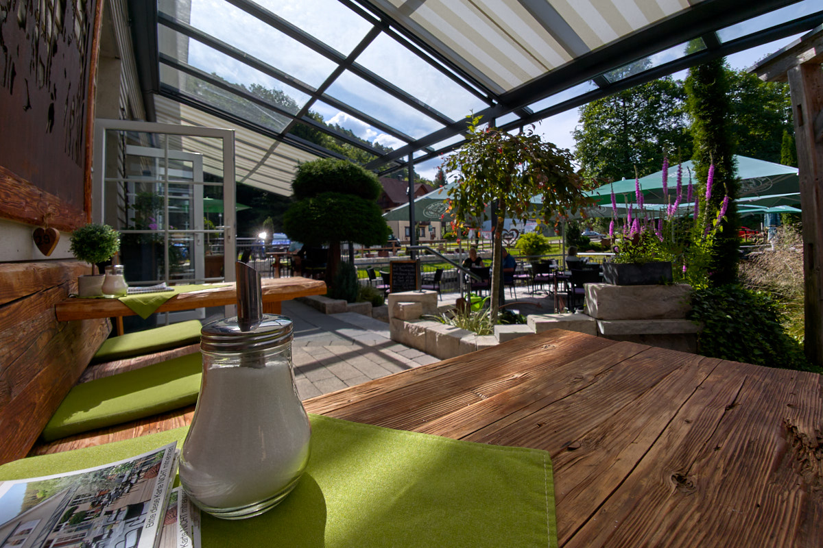 Dann weiter. So langsam könnte ich einen Snack vertragen. Kurz vor Klosterreichenbach ist ein nettes Café direkt neben der Straße. Da gönne ich mir ein Stück Zwetschgenkuchen und einen Pfefferminztee. Und ich kann unauffällig die Wasserflasche auffüllen. Sehr gemütlich hier!