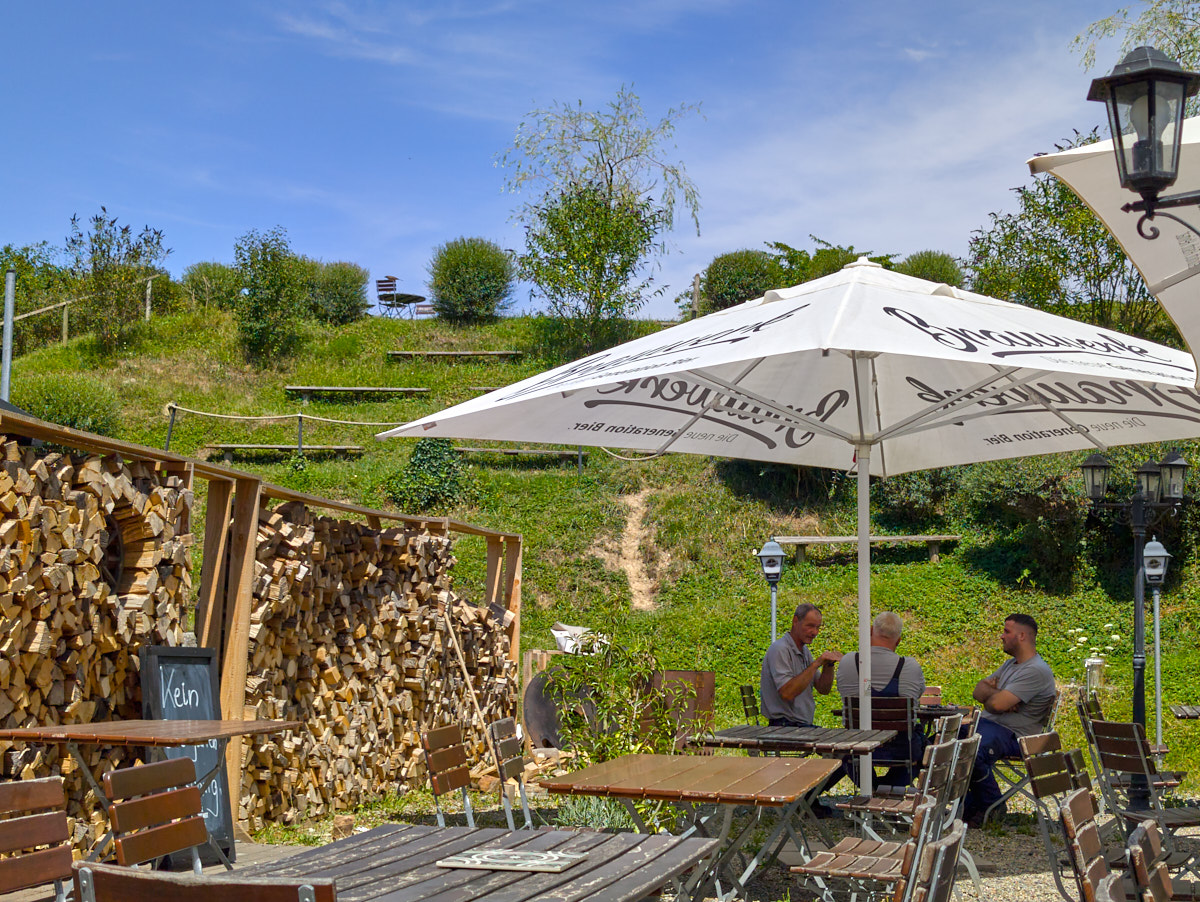 Oben auf der Höhe stoppe ich an einem Wanderparkplatz im Wald. Da ist eine Sitzgarnitur im Schatten, die nehme ich mir. Ich lege mich hin, mache aus dem Halstuch eine Augenbinde und dann ein kurzes Nickerchen. Nach zehn Minuten kommt eine Familie mit vier kleinen Kindern an. Da ist Schluss mit Schlafen, aber egal. Es hat gut getan.