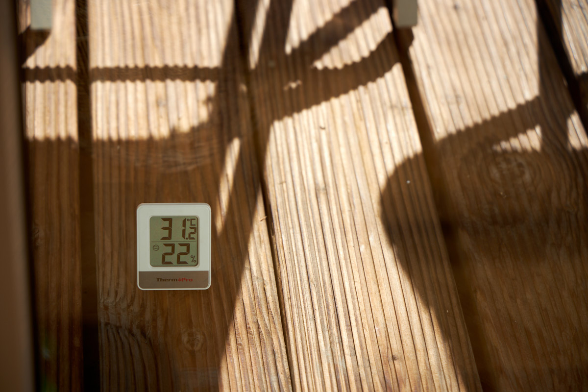 Wie viel Grad werden das sein? Ich hab ja ein Thermometer. Ich stelle es eine Weile raus unter den Stuhl in den Schatten. Und was soll ich sagen: ernsthaft, Leute, heute nachmittag, 18. Oktober um 13:48h: