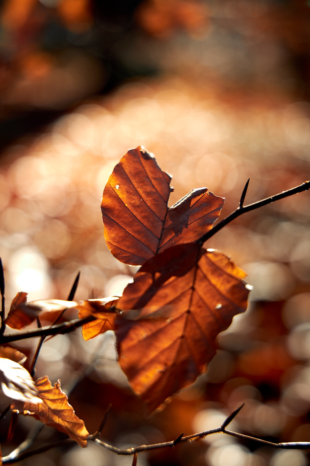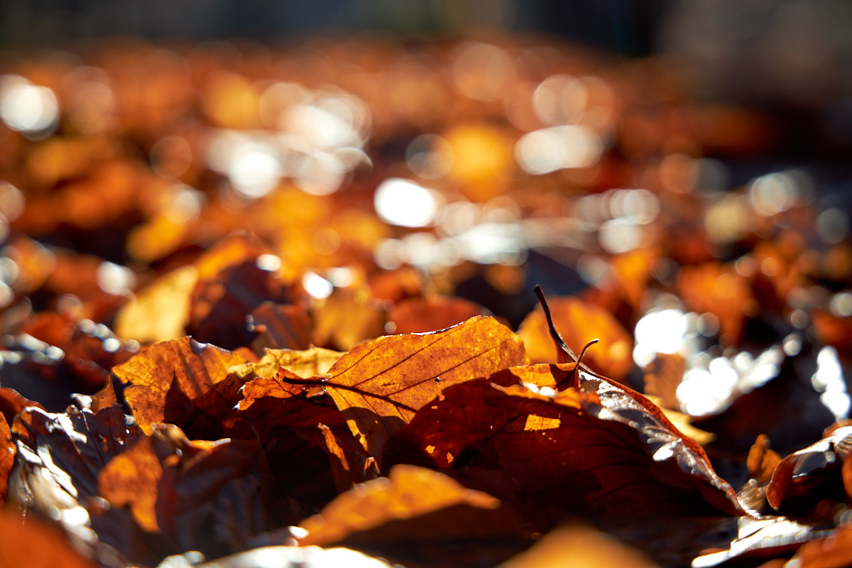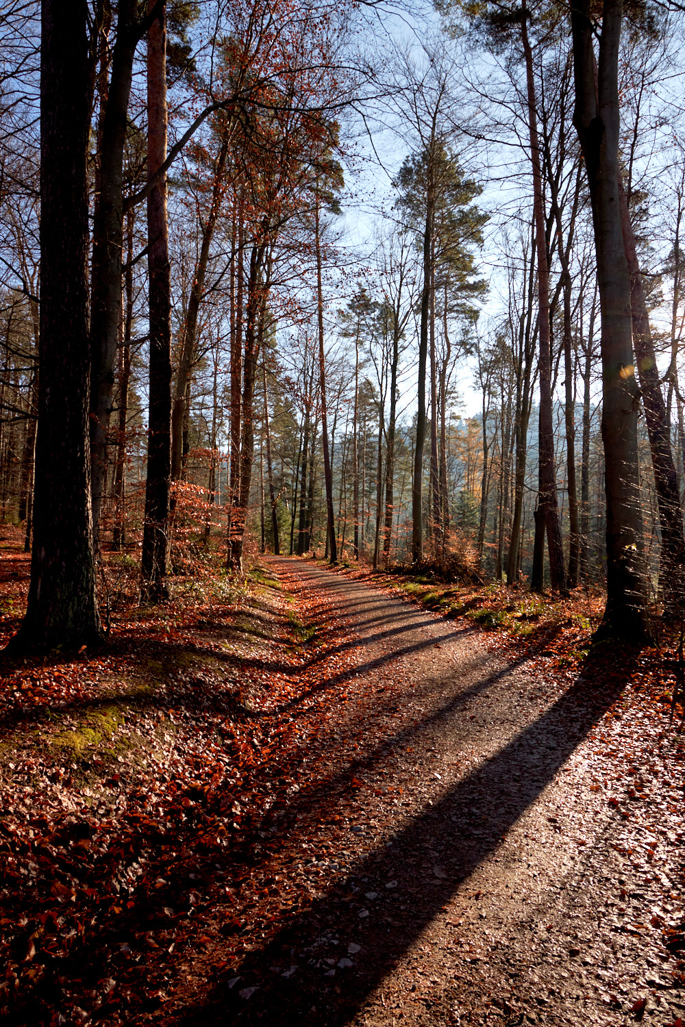 Ich fotografiere das rostrote Laub auf dem Boden. Die Sonne, die durch die kahlen Bäume strahlt. Die Lärchen, die jetzt so richtig leuchten.