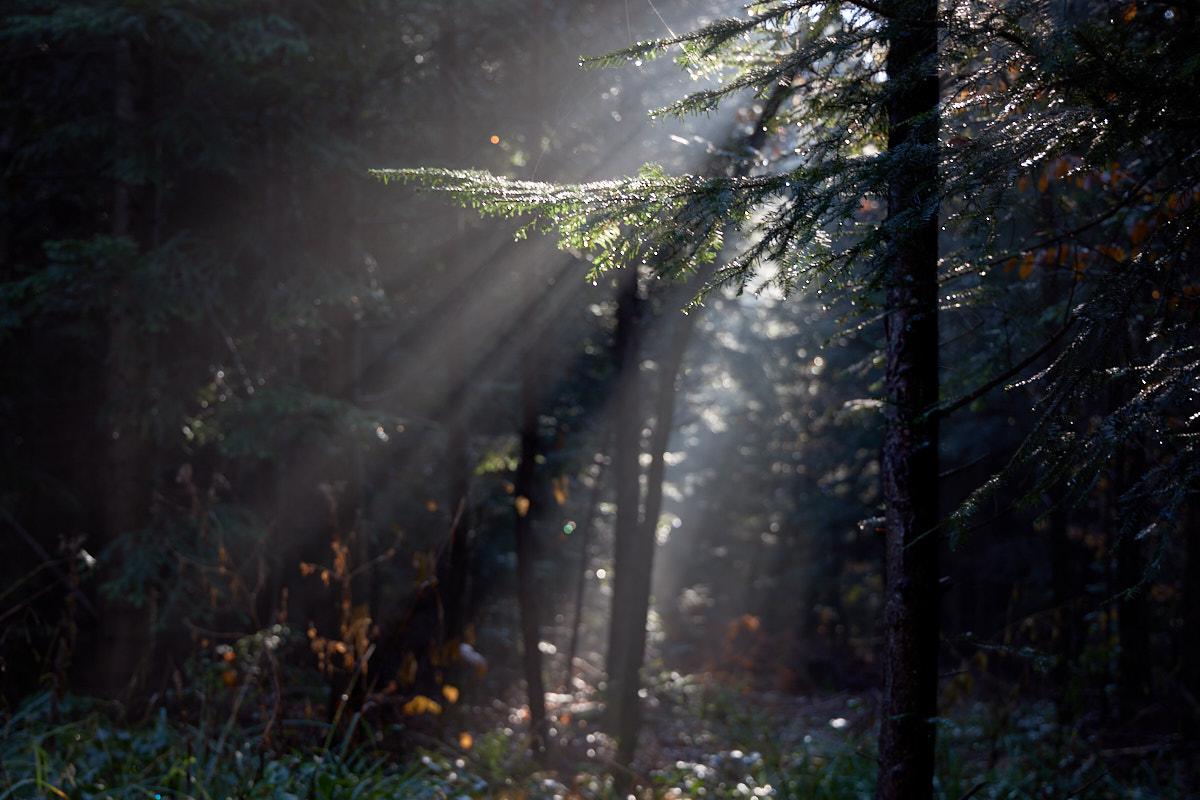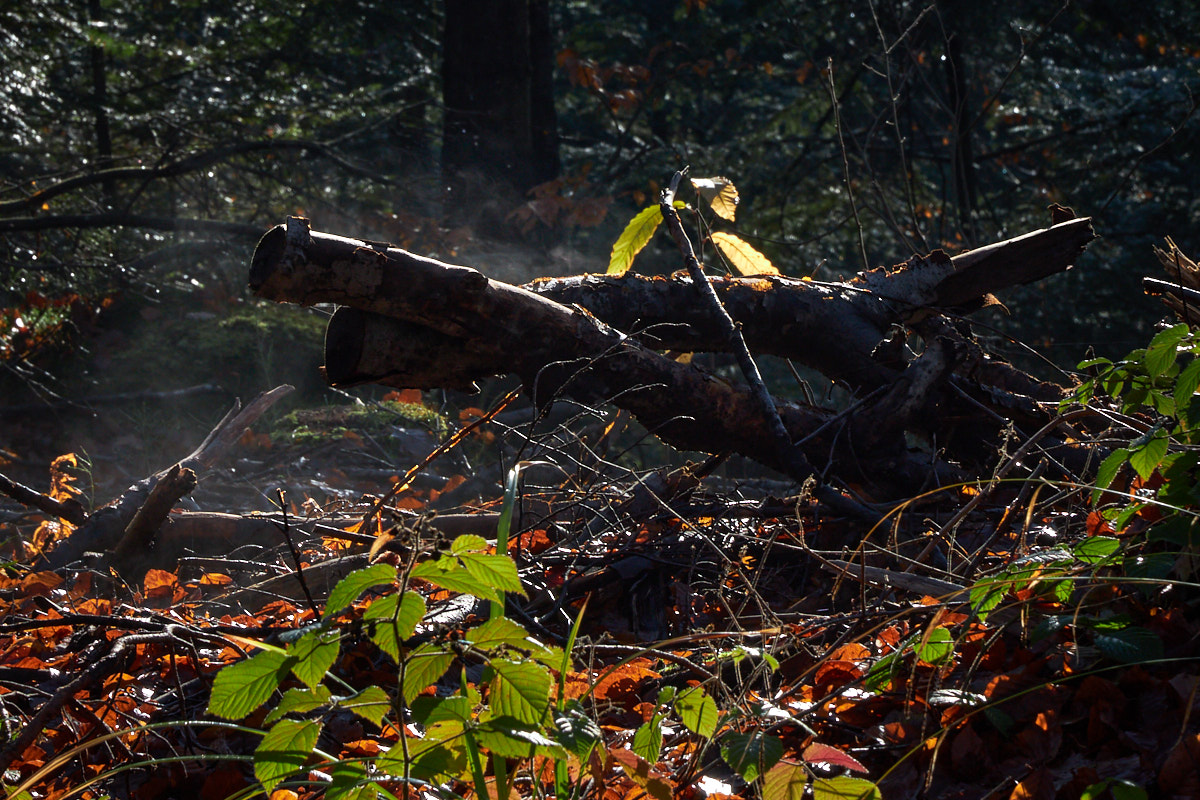 Dann fahre ich ein Stückchen weiter. Und halte unvermittelt an: Dunstschwaden ziehen aus dem Wald. Sonnenstrahlen malen Lichtmuster in die Waldluft. Mit jeder Minute verändern sie sich mit der bewegten Luft. Wo die Sonne auf den Boden trifft, steigt überall Dampf auf. Ich kann mich gar nicht satt sehen (und fotografieren).